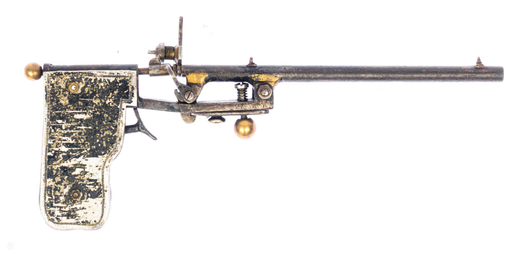 Eine „Pistole“ Terzerol Kal. 6 mm Flobert, die schon irgendwie eine Hauch von Do-It-Yourself hat, wäre da nicht noch ein anderes absolutes Highlight, nämlich die Pistole unbekannter Eigenbau. Plätze dürfen da wirklich keine Rolle spielen, wenn man sich so ein Teil auf die WBK legt 🙂